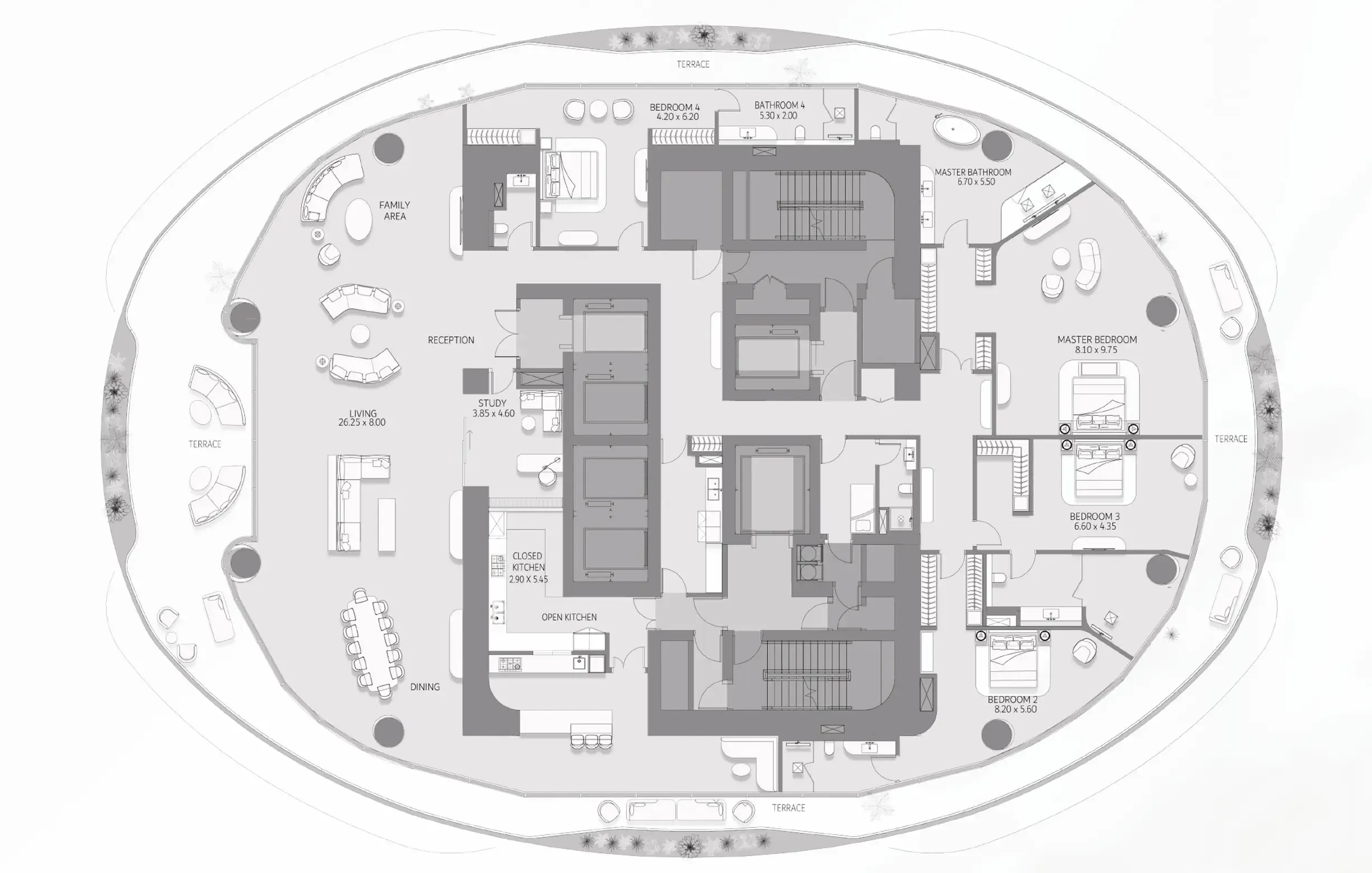 This water-inspired tower boasts 71 floors - each resembling a unique ocean wave. This is the latest chapter in Nakheel’s ambitious vision for extraordinary waterfront life in Dubai. The statement structure is sculped into a series vertical lakes, including a variety of communal pools and a selection of exclusive private pools. Explore sweeping terraces with glistening pools and verdant greenery, gaze out at breathtaking views over the sea and cityscape, and relax in wonderfully spacious homes with outstanding amenities. The exclusive collection of luxury apartments and exceptional amenity suite offers residents an ultra-chic, cosmopolitan lifestyle surrounded by art and beauty. Extremely spacious interiors lead out onto vast terraces embellished with lush greenery and unique private pools. Admire breathtaking views towards Burj Al Arab, Burj Khalifa, Palm Jumeirah, and Ain Dubai as you relax and breath in the fresh sea air. Each exclusive apartment enjoys either 180- or 360-degree panoramic views.